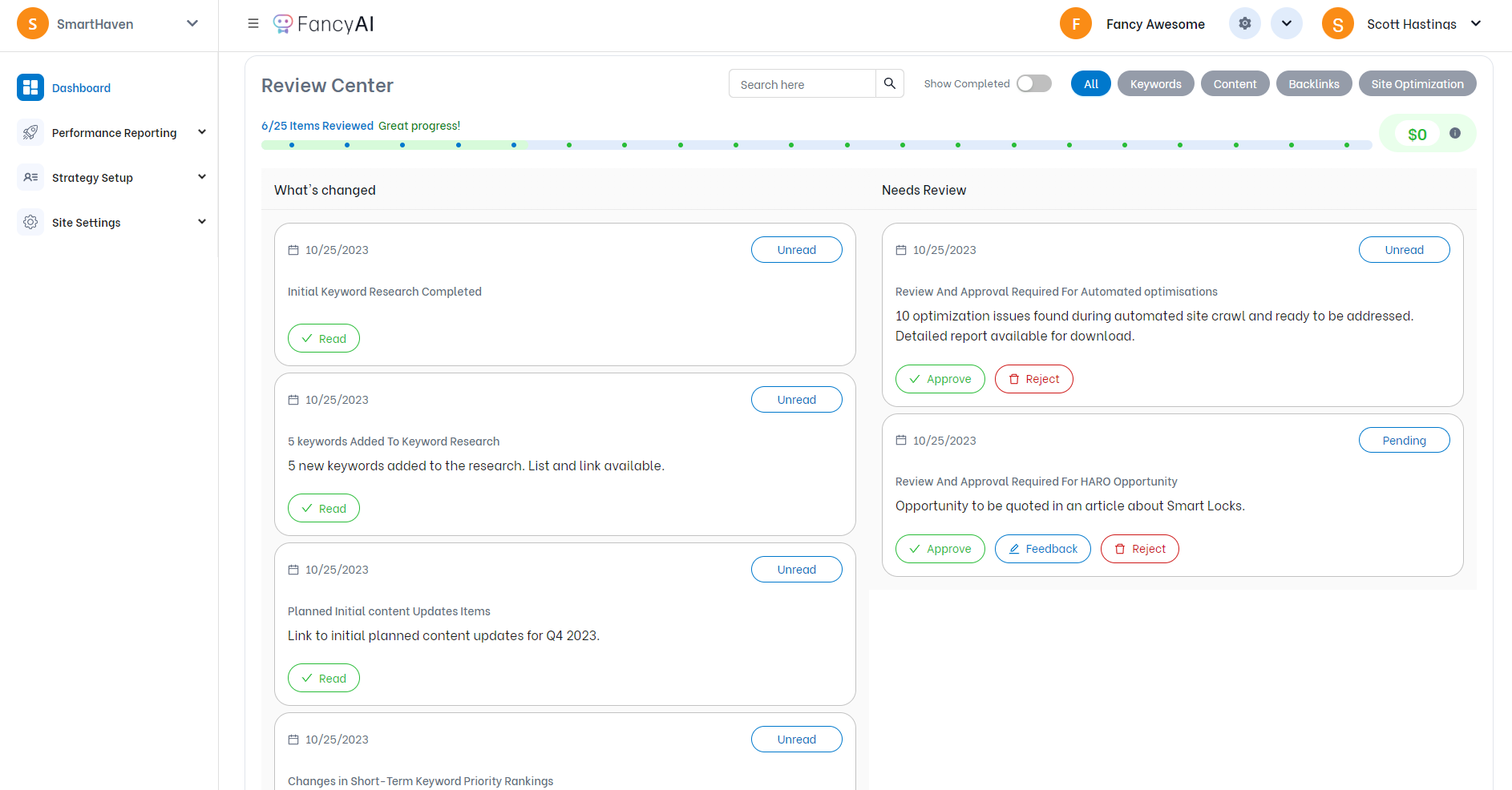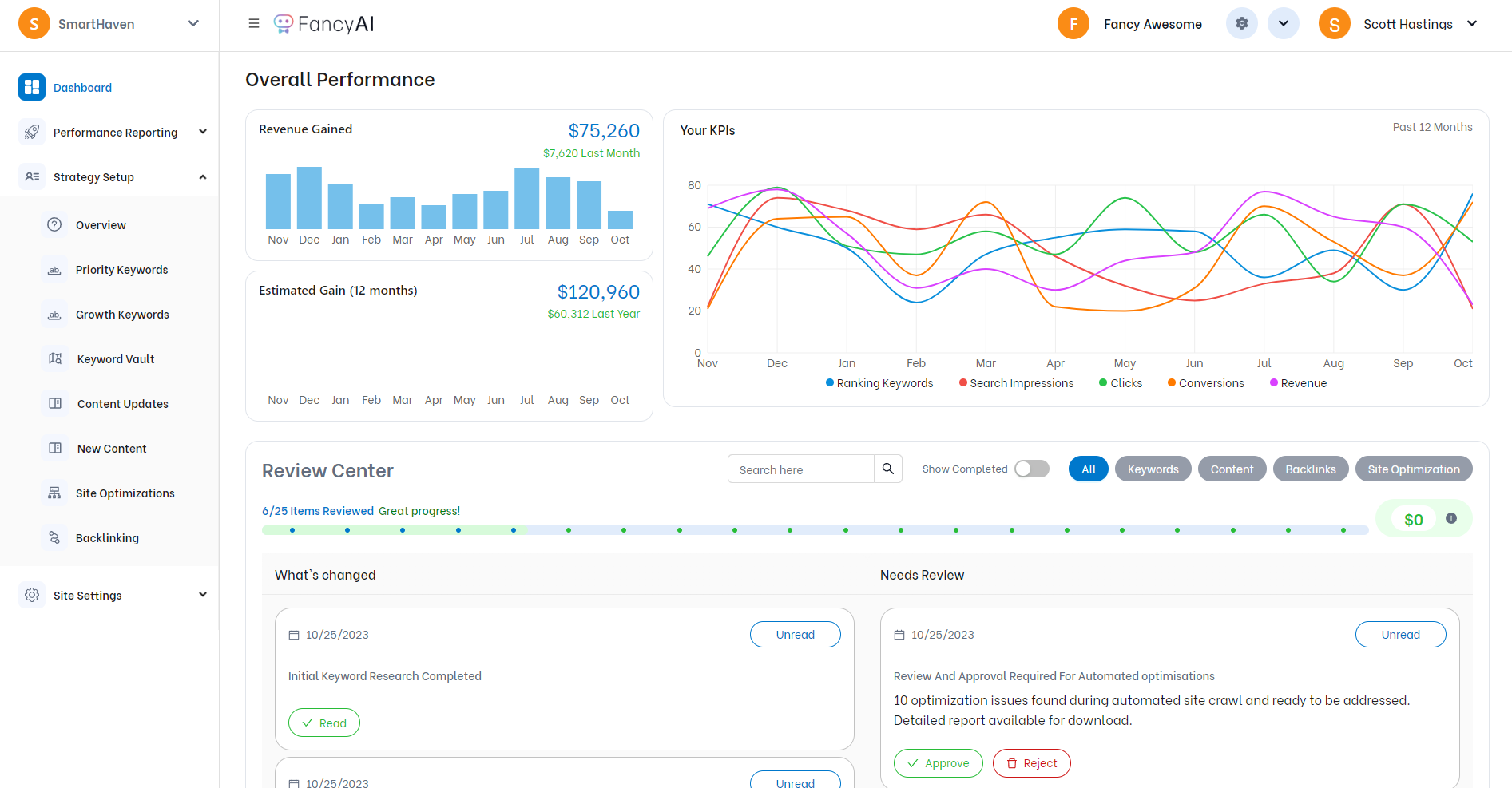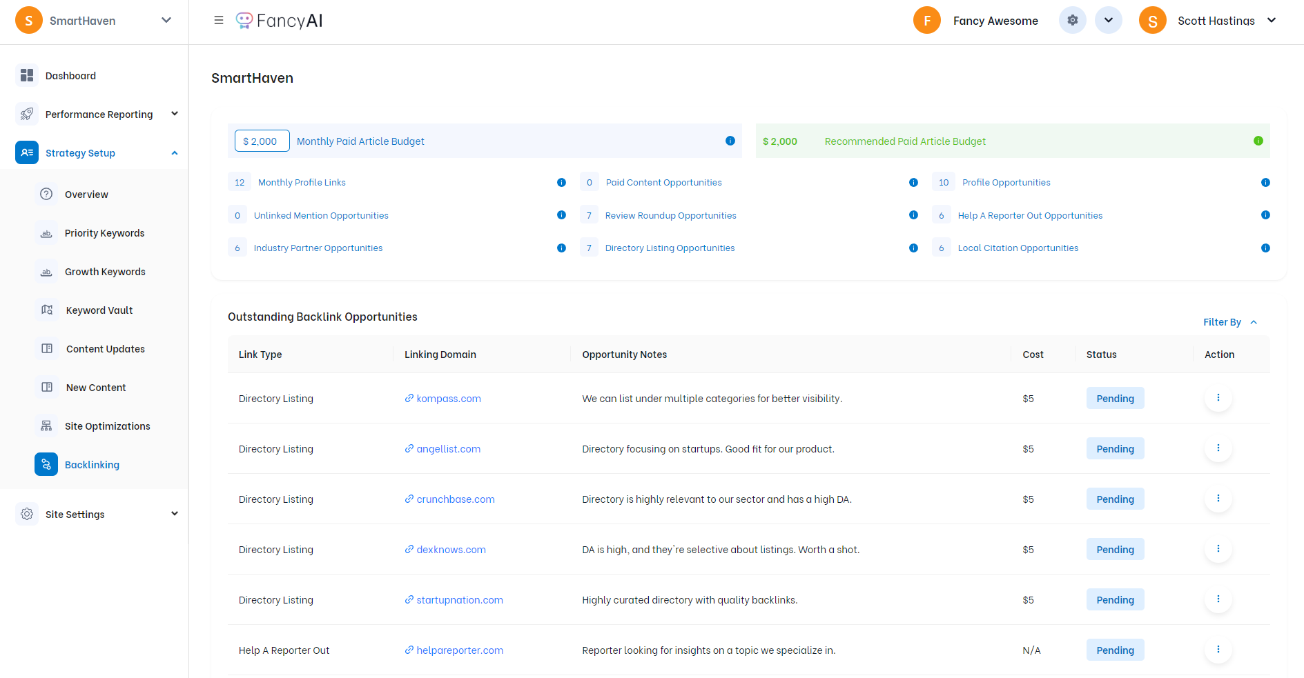 FancyAI is a fully-integrated SEO platform that strategically finds opportunities and secures the listings at the top of search that will grow your business. Push-button approval lets you sit back while FancyAi does all of the hard work.